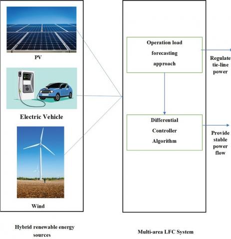Figure 2 depicts proposed multi-area LFC system. Load frequency control in renewable energy penetrated hybrid power systemsconsists of several controller units, turbines and governorwith speed limiter and biasing module which are connected with the help of tie lines and the unscheduled tie- line power is regulated through operational load forecasting approach and the differential controller in multi-area system perform well in islanding mode by separating high load demand area from the system.Thus the implementation of the controller controls the load frequency deviation of renewable energy resources of a multi-area integrated microgrid power system with mitigated load side disturbances, nonlinearities with scheduled tie-line power, and mitigating centralized islanding conditions.