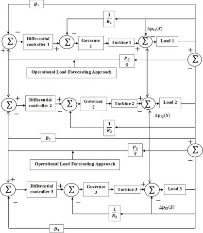 Figure 7 demonstrates the simulated performance of a single-area LFC hybrid power system. In a single area, differential controller module, generator module, and turbine module are included with the load. To regulate frequency deviation and predict proper load forecasting in transmission lines, Operational load forecasting approach has been used. Differential controller in the single area regulate frequency response and isolate that area when more load demand is predicted.