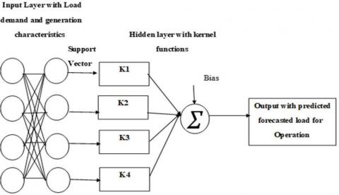 The regression function in the regression analysisfor load forecasting is based on the restricted observation data. Therefore, to calculate the power system's dynamic frequency following a disruption, support vector regression (SVR) is being used.The Support vector regression model takes the inputs related to loading and the input layer process the recurrent characteristics of load demand and load generation input vector form. Then, these input vectors are converted into support vectors and the hidden layer uses a kernel function to process the input support vectors of load characteristics by utilizing weights and objective function to provide load deviation prediction output based on forecasted time details.