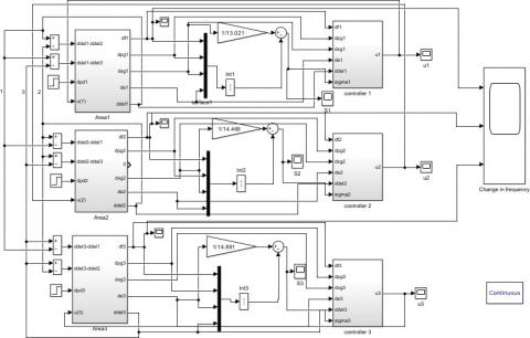 Figure 6 illustrates the simulated performance of a multi- area LFC hybrid power system. An electric car, a solar cell, and a wind area are three of the renewable energy sources that are connected in a hybrid power system between three areas in the simulated output using a tie-line. Support vector regression module is included in multi-area LFC hybrid power system to provide accurate load forecasting and load management system using objective function and temporal dependence characteristics. Differential controller module predicts and isolates the high load demand area using sigmoidal range functions to provide stabilized frequency modulation.