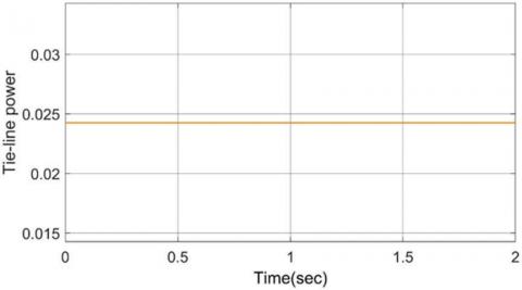 Figure 8 demonstrates the proposed system's tie-line power. The proposed technology keeps the tie-line power constant at 0.024 during a time range of 0.001 to 2 seconds. Implementing an operational load forecasting technique that manages forecasting load with a tolerable degree of error using support vector regression-based prediction, the suggested system's tie- line power is kept at an appropriate level.