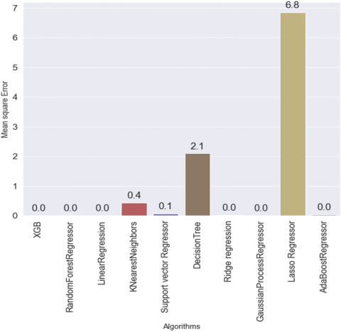 Linear Regression achieved the most accurate result in all aspects while Lasso regressor achieved the least accurate result. As mentioned in Table 3, Linear Regression achieved the greatest result with the R2 and Adjusted R2 value of 1.00 which is the most accurate, it also produces zero error with mean squared error equal to zero, root mean squared error equal to zero, mean absolute error equal to zero, and mean absolute percentage error equal to zero. Which is an ideal scenario. Gaussian Process Regressor, Xtreme gradient boosting, and Random forest regression were the second, third, and fourth best respectively with slightly higher mean absolute error and root mean square error. Lasso regressor performs poorly in all the metrics.