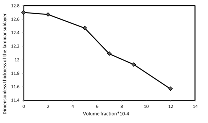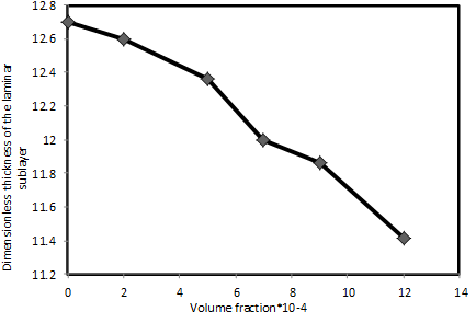 Figure 10. The curve for the changes in the dimensionless thickness of the laminar sublayer in terms of the variations in the volume fraction for the MgO/water nanofluid