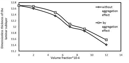 Figure 11. The curve for the changes in the dimensionless thickness of the laminar sublayer in terms of the variations in the volume fraction for the MgO/water nanofluid considering the aggregate effect