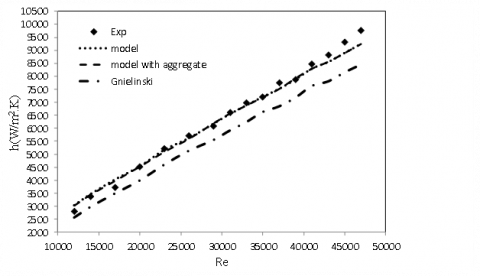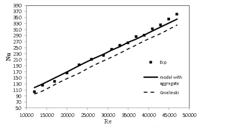 For instance, in Figures. 13 and 14, the changes in the Nusselt number in relation to the Reynolds number were compared at concentrations of 0.12 % of the MgO nanoparticle in the model state with and without considering the aggregate effect, Gnileinski model, and experimental values. In addition, in Figure. 15 the curve for changes in the convection heat transfer coefficient in relation with Reynolds number at concentrations of 0.12 % of MgO nanoparticle obtained from the models that neglect the aggregate effect, those that consider the aggregate effect, Gnileinski model, and experimental values were compared.