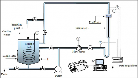 To measure the heat transfer coefficient, a set of heat exchange devices, whose schema is illustrated in Figure 1 was utilized. This set has been totally made out of stainless steel and acts in the form of a closed cycle. This cycle includes heating sections, quarreling sections, along with measurement and control devices. The nanofluid flows in the closed cycle that consists of sections of temperature control, fluid storage tank, the main line of the flow, flow rate measurement device, pump, control valves, and the heat transfer experiment section.