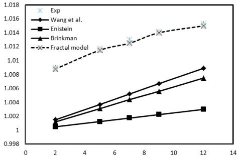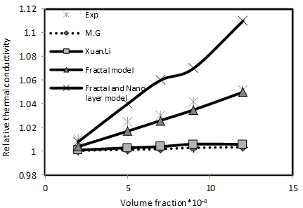 According to Figure 7, comparison between the M.G. model that neglects the aggregate effects with the three models of fractal, Xuan and Li, and fractal and Nano layer, which consider the aggregate effect, reveals that fractal model offers the best responses with the experimental values.