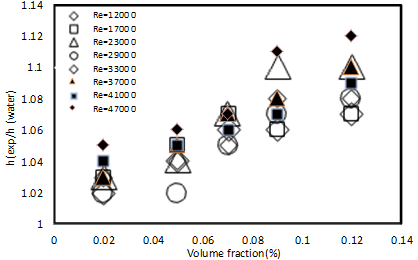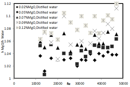 Figure 8. The curve for the ratio of heat transfer coefficient of MgO/water nanofluid to distilled water at different concentrations of nanoparticles in terms of the Reynold’s number