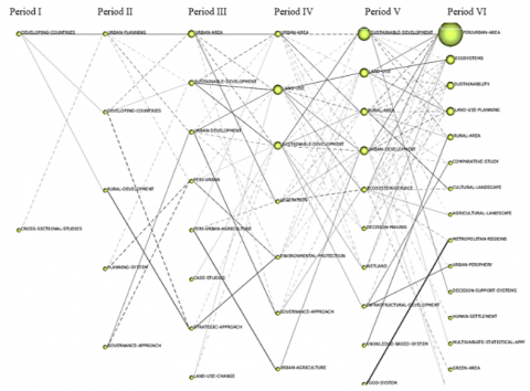 During Period V (2013-2017), land use and sustainable development research expanded [56-59], with more connections between and within cluster themes. Articles on knowledge systems, infrastructure development, and wetland development stood out but received fewer publications. Food system research began, while ecological services and urban development remained major issues.