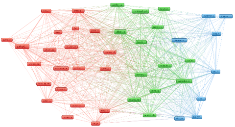 It may be observed that the cluster in red and green are well connected whereas the cluster in blue seems to lack connections with the rest of the two. It might imply that research on peri-urban planning and related projects globally has not used the physical transformation aspect with the help of indices and metrics for evaluation, therefore, the physical transformation research is said to be done in a stand-alone entity (Figure 6).