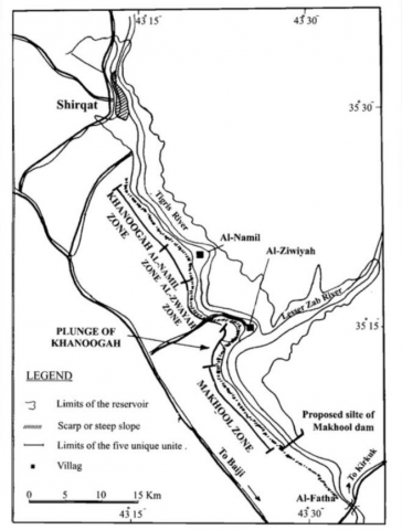 Makhool dam is an earth dam with clay core (under construction), it is located on Tigris River in Iraq, it is located 16 km of Al-Fatha bridge and 30 km North-east Baijy town in Salah Al-Din Governorate, the dam axis extends from the eastern side of Makhool anticline about 3 km, about 15 km downstream from the lesser Zab River junction with the Tigris River in Iraq and 249 km from Baghdad (Capital of Iraq).
