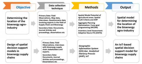 Some of the problems in the bioenergy supply chain include: 1) the bioenergy supply chain model has not been effective and adaptive in terms of the fulfillment of raw materials (biomass) both qualitatively and quantitatively, so it is necessary to map potential bioenergy agroindustry areas to formulate priority regional development strategies. Determination of potential bioenergy agroindustry areas can facilitate the government in taking development strategy policies. 2). Aggregate production planning in the bioenergy product processing industry is currently influential in determining the amount of production and supply of biomass. The company does not have a definite value for a series of objectives, such as limits on the number of goods produced, the maximum or minimum amount of inventory allowed, limits on the availability of working hours, and minimum income with minimum production target constraints that must be achieved, this causes the unclear value of achieving existing objectives to achieve optimal conditions. The importance of making production planning to calculate the optimal amount of production using the fuzzy goal programming method and biomass inventory assessment with the ANFIS approach. 3). The importance of the need for optimal bioenergy supply chain management with a decision support system (DSS) for stakeholders in formulating strategies for developing potential bioenergy agroindustry areas and adaptive inventory management for bioenergy industry players in determining the amount of inventory for aggregate production planning.