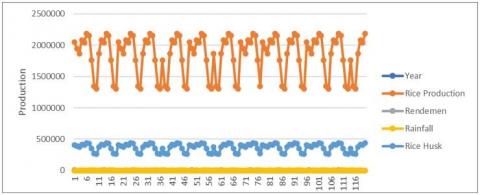 Graphic User Interface (GUI) of 3 input indicators in the form of the amount of rice yield (Ton), yield (%), and rainfall (mm) to produce predictions of the number of rice husks produced as supplies for the bioenergy manufacturing process, made with the Matlab application GUI. GUI assessment of rice husk inventory levels in Figure 9.