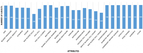 This research made use of information gathered on CKD.11 There are 14 rows and 400 columns in this data set. In the results, you'll see a "class" column with either "yes" or "no." In this case, the yes vote was worth one and the no vote was worth zero. Using the value "1" to indicate that the patient does really have CKD and the value "0" to indicate that they do not is common practise. Figure 1 displays the data set's properties.