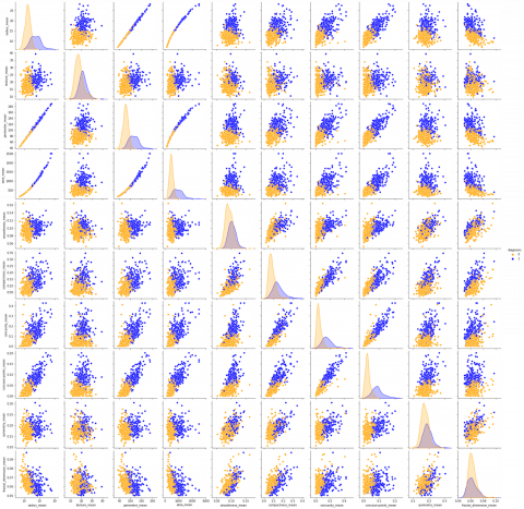 For each nucleus in this data set, the first ten core characteristics with real values are generated using ROI - radius (the mean distance between points on the perimeter and the center), texture (Grayscale value’s standard deviation) perimeter, area, smoothness (varying locally in radius), compactness (perimeter2 / area - 1.0), concavity (severity of the contour's concave regions), concave points (concave regions there in the contour), symmetry, fractal dimension ("coastline approximation" - 1), We compare all ten features as shown in the Figure 4.