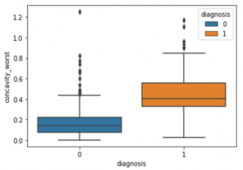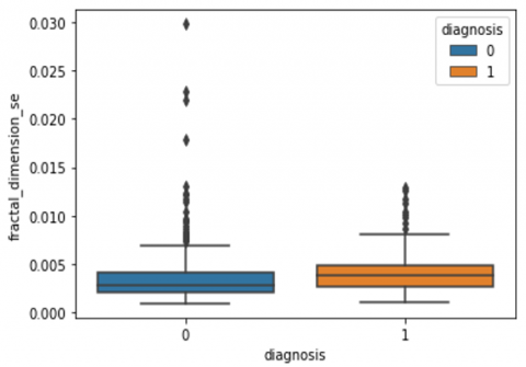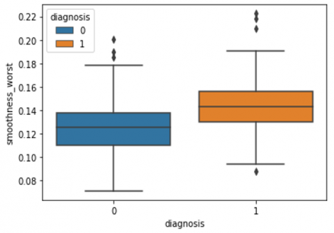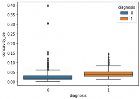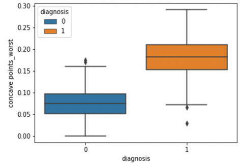 Human-computer interaction is vital for improving and maintaining high-level cancer detection skills. The results revealed that utilizing a low-cost display monitor and a variety of HCI approaches, observers may be trained to distinguish some critical breast cancer appearances. Deep learning applied to a specific clinical application for radiology image processing, which is known as computer-assisted diagnosis (CAD) [42]. To determine which features are helpful for classification, a box plot is used to show the classification. Since the median values for radius mean, perimeter mean, and area mean differ significantly in this instance, these characteristics are important for classifying cancer. However, the box plot of these characteristics is virtually same, thus we may select any feature from these features to decrease the size of the data collection or the computational complexity of the prediction as show in Figure 5. Box plot will show the data for all features having details of lower quartile (25% data below such value), upper quartile (25% data beyond this and 75% of data above this value), median (mid point of data), max denote highest value and min denote the lowest score.