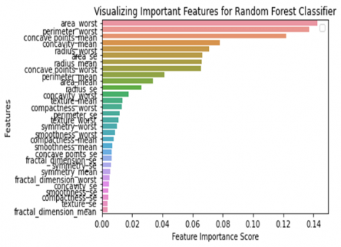 Figure 11 shows over all importance of all features for classifiers, area worst, perimeter worst, texture worst, concave points worst, and concave points mean are common features in all classifiers that perform well. Till now SVM perform well in all aspects, in future aspects if we use features having high importance than we achieve accuracy up to 100%.