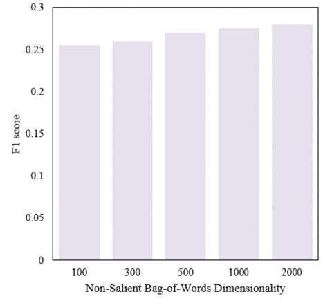 The experimental results from Figure 8 indicate a slow but steady increase in the F1 score of the proposed method as the dimensionality of the non-salient bag-of-words increases, from 0.255 to 0.28. This result suggests that even non-salient bag-of-words features contribute to enhancing the algorithm's annotation and recognition performance as the dimensionality increases from 100 to 2000. It can be inferred that while non-salient features may not contain information as directly relevant as salient features, at higher dimensions, they still provide useful contextual information for the model, assisting in a more comprehensive understanding of image content and improving the precision of semantic category recognition and annotation quality. These results emphasize that information from non-salient regions should not be entirely disregarded, as they may contain supplementary information beneficial to the overall recognition and annotation tasks. By integrating these non-salient features, the proposed algorithm demonstrates its effectiveness in enhancing multimodal image recognition and annotation performance. Moreover, the performance improvement with increasing bag-of-words dimensionality shows the algorithm's capability to handle large-scale features, effectively refining key information while ensuring comprehensive information processing, thus offering a robust methodological foundation for multimodal image processing.