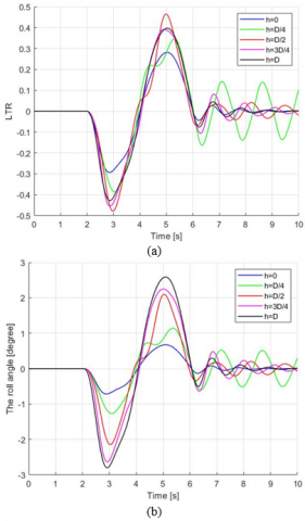 In the case shown in Figure 7a, when the tank truck turns stably, the two indicators LTR and LTRN can see the error at liquid level D/2 is 9.7%, at 3D/4 is 8.4%. Similarly, in the case of a vehicle moves lane change maneuver as shown in Figure 7b, the error is 2.1% at D/2 and 1% at 3D/4, respectively. This error is due to LTRN takes into account the displacement and displacement velocity of the unsuspended mass. On the other hand, these two factors actually also affect the tendency to the vehicle rolling and in the research results [26] show this error is still allowed, so the LTRN index matches the LTR index. Besides, the phenomenon of vehicle rollover only occurs in a short period of time, so the control to prevent this trend from occurring requires quick response. When the tank truck tends to roll, the LTRN value will reach the rollover threshold faster than the LTR and the active suspension system will exert its full capacity. Therefore, the LTRN index is used to evaluate the enhancement of rollover stability of liquid circle tank trucks when the vehicle changes movement direction.