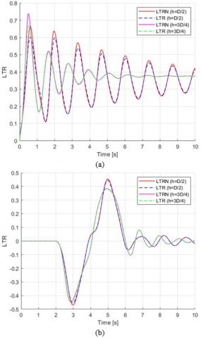 Figure 6. The LTRN index (a) and TRA (b) in lane change maneuver