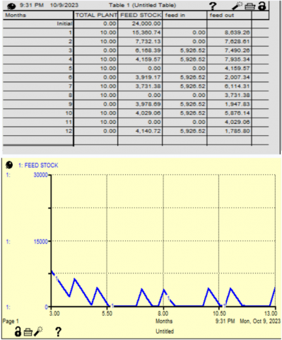 The vacancy condition of fermented feedstocks is improved in the second model of feed fulfillment from the corn-goat integration system seen in Figure 7. In this model, planting pattern modification is carried out, with the first planting covering an area of 10 hectares and the second planting covering an area of 10 hectares separated by one month. The number of peaks in the figure shows the occurrence of successive harvests in regions 1 and 2. This model has a benefit over the previous model in that the biomass rise at harvest time is not too high, lowering the cost of storing feedstocks. However, planting engineering on this model has not solved the stock vacancies in months 6, 9, and 12. This is because the demand for goat feed exceeds 8 tons per month, while the incoming feedstock is only about 6 tons due to the division of planting patterns. So, although it has more harvest fluctuations than the existing model, this improved model still has a feed deficit.