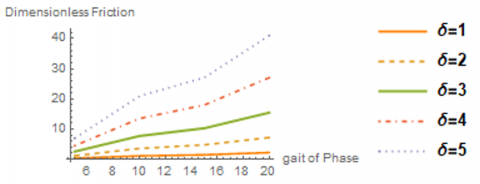 Dimensional friction force (ξ*) as a function of the gait phase (ω) for different nature of the contacting surfaces (δ),the nature of the surface: Friction depends on the nature of the contacting surfaces, as rough surfaces will need more force to move them than if those surfaces are smooth, as the force of friction decreases with the increase in the smoothness of the body to a certain degree, but if it exceeds that degree, the friction actually increases between two surfaces They are very smooth due to the increased electrostatic forces between their molecules as shown in the Table 6 and Figure 10.