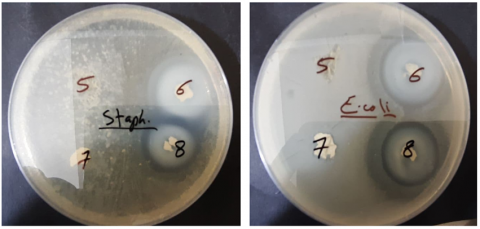 Figures 6 and 7 show the size of the housing area of bacteria for the composite coating layer (ZnO+HA+chitosan-alginate).