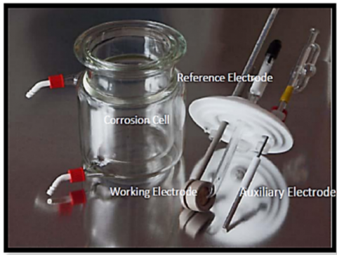 As shown in Figure 2, the corrosion measurement/EIS set consists of a computer, thermostat, magnetic stirrer, potentiostat/galvanostat, and EIS (Vertex One, Ivium Technologies, Netherlands). Pyrex cell volume (100 mL) with internal and external vessels. The electrochemical cell typically has three electrodes, which are as follows: