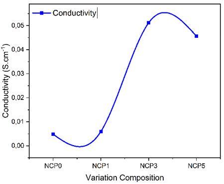 Figure 5 illustrates the membrane conductivity of NCP0, NCP1, NCP3, and NCP5. As shown in the sample graph, NCP3 shows a higher conductivity of 0.0512 S.cm-1 compared to the NCP0 membrane 0.0048 S.cm-1 and NCP1 0.006 S.cm-1. However, NCP5 has a lower conductivity than NCP3 with a value of 0.0456 S.cm-1. This is because NCP3 is more dispersive than NCP5, resulting in a higher conductivity peak. On the other hand, NCP5 has a higher density than NCP3, making it more difficult for ions to move and reducing the conductivity value. Nevertheless, NCP5 has higher strength than other membranes due to the increased density of NCC paper.