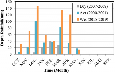 The rainfall in the study area is distributed with low depth and fluctuating value. Dry season is the rainfall season which has a minimum depth of rainfall during the study period, which was achieved during the season (2007-2008) with total annual rainfall depth of 97 mm, while the average season is the rainfall season that has a depth of rainfall in between the minimum and maximum rainfall depths during the study period (arithmetic average of rainy season depths), which was achieved during the season (2000-2001) with total annual rainfall depth of (342) mm, and the wet season is the rainfall season that has maximum depth of rainfall during the study period, which was achieved during the season of (2018-2019) with total annual rainfall depth of (618) (mm).