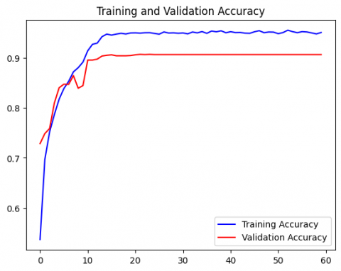 Figure 10 demonstrate the testing and training accuracy curve over 60 epochs. During the Initial Training Phase (0 - 10 epochs), training accuracy and testing accuracy starts increasing rapidly which illustrates learning happens efficiently. There will be slight fluctuations in testing accuracy as the model trains. In the middle training phase (10-20 epochs), training accuracy improves and stabilizes around the 20th epoch. Validation accuracy also stabilizes, slightly lower than training accuracy, indicating good generalization without significant overfitting. In the later training phase (20-60 epochs), Training accuracy plateaus above 0.9, showing the model has learned the patterns well. Validation accuracy remains around 0.9, closely aligning with training accuracy, suggesting strong generalization and minimal overfitting.