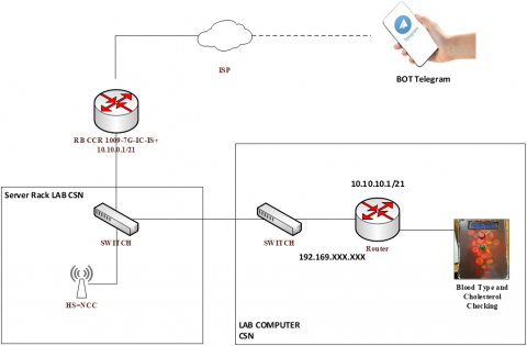 Figure 5 depicts the network architecture design showing the connection of the Arduino Uno to the switch. The network topology, as illustrated, employs various technologies. It starts with an internet source linking to the RB CCR 1009-7G-1C-1S+ proxy router at IP address 10.10.0.1/21. This router then connects to the switch at the CSN (Computer System and Network) Laboratory Server. Attached to this switch is the blood type and cholesterol checking device, assigned the IP address 192.168.137.2/24. Subsequently, this device communicates the results of the blood type and cholesterol tests to a Telegram bot.
