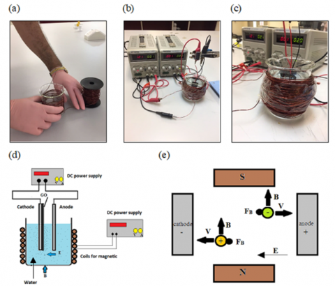 Figure 3. (a) The making of 120 loops of copper wire for generating 23 G magnetic field; (b)-(c) The electrodeposition system with GO-based electrode and CMF applied; (d) The schematic diagram of GO-based electrode with CMF-assisted electrodeposition system assembly for heavy metal ion removal; (e) The diagram of FB resulted from CMF in the process of electrodeposition of a paramagnetic of Cu2+ and negative ions in the setting of $B \perp E$ where E is electric field and V is the velocity of ions