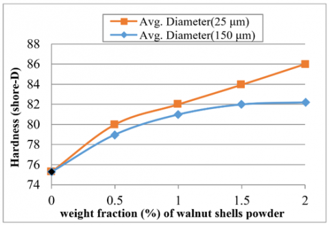 Figure 5. Hardness (shore-D) of PMMA composite specimens as a function of weight fraction content and a particles size of walnut shells powder