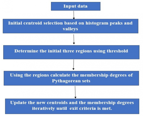 The Pythagorean fuzzy c-means method was recently proposed for image segmentation [27, 28]. It used min-max parameters to fuzzify and de-fuzzify the image data and used distance measures for clustering. However, the dependency with min-max is not suitable for all types of image data; therefore, a generalized Pythagorean fuzzy c-mean is proposed to extract the tissues of brain AD images. The method uses histogram peaks as initial centroids that help determine the initial degrees of PFS. Using these initial degrees, constrained fuzzy c-means are applied with the Pythagorean objective function, which reduces clustering errors and provides higher data inclusion than intuitionistic fuzzy sets. Kirisci and Simsek [29] proposed advancements in techniques for addressing group decision-making challenges.