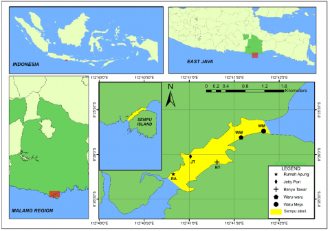 A research study was conducted on Sempu Island, Malang Regency, at five locations during December 2022, February 2023, and April 2023. The research was conducted at five stations, specifically Watu Meja, Waru-Waru, Banyu Tawar, Rumah Apung, and Jetty (Figure 1). Watu Meja (ST1) is located at the mouth of the strait and is largely unaffected by human activities and tourism. Waru-Waru (ST2) is a popular tourist destination, visited frequently by tourists for activities such as snorkeling and swimming. The salinity of Banyu Tawar (ST3) is believed to be influenced by freshwater input from the estuary. The Jetty (ST4) is directly influenced by various activities, including fisheries and port operations. This station is frequently affected by both liquid waste from ships and solid waste. Rumah Apung (ST5) is affected by domestic waste due to its proximity to residential areas.
