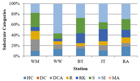 The results of the overall benthic substrate cover are shown in Figure 4(B). Sempu Island Nature Reserve consists of an overall of 8 substrate types, which include hard coral (HC), dead coral (DC), dead coral with algae (DCA), rubbles (R), rocks (RK), sand (S), silt (SI), and macroalgae (MA). The figure provide insight into a substrate that is suitable to successful recruitment due to its high stability. Examples of such substrates include dead coral with algae (DCA), dead coral (DC), and rocks (RK). The stability of DCA is considered to be as beneficial; nevertheless, the recruitment process of coral planula may be hindered by the presence of algae that covers the surface of dead coral.