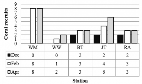 A total of 22 coral recruits (Figure 5) were found at the five stations during 3 months of observation and their numbers increased or remained constant. The highest number of recruits was at Watu Meja station with a total of 8 recruits in the whole month. In December, no recruits at the WM station were found in the transects during observations, but in the following months, namely February and April, 8 recruits were found in each month.