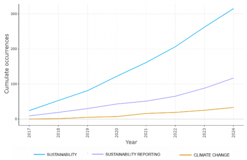 This trend also highlights the need for in-depth analysis in area of sustainability and climate change reporting. With increasing awareness and attention to global environmental issues, further research linking sustainability with sustainability and climate change reporting will be essential to build a more comprehensive and integrated framework. This study may fill that gap by providing analysis on sustainability and climate change.