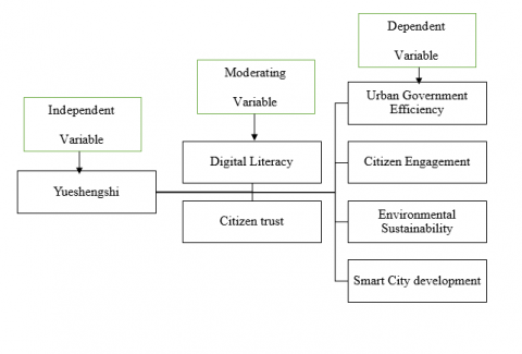 Despite the increasing literature on digital Governance, the direct relationship between e-governance platforms such as Yueshengshi and its role in enhancing smart city development is unclear. Urban efficiency, citizen engagement, and sustainability. This means that existing studies have mostly explored the positive impacts of E-governance, such as urban efficiency and the relationship between government and citizens, whereas the empirical evidence to know the impact of digital governance platforms in urban management in specific regional contexts such as Guangdong and Yueshengshi is least explored. Here, the role of critical elements such as citizen trust and digital literacy in the adoption and satisfaction of the public with digital governance applications have also been least explored. Therefore, this study aims to address these research gaps by analyzing the role of Yueshengshi in smart city development in Guangdong while investigating the mediating and moderating factors, such as digital literacy and citizen trust.