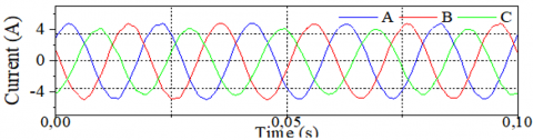 The second scenario depicts the machine operating under a supply unbalance, specifically affecting one of the phases. In this case, the unbalance predominantly impacts the current of the affected phase, but it also induces secondary effects on the remaining phases.