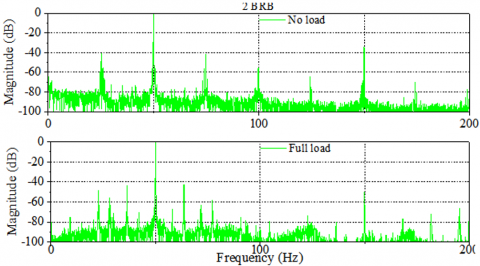 Furthermore, as the load increases, the fault frequencies shift further away from the fundamental frequency, reflecting the increased slip (g) under load conditions. This shift is accompanied by a proportional rise in the amplitude of these characteristic frequencies, signifying the severity and progression of the rotor fault. The amplitude increase becomes more pronounced with higher fault levels, offering a clear and quantifiable diagnostic marker for identifying BRBF. Additionally, the effect of load on these frequencies is evident, as they move further from the fundamental under full load due to the increased slip, highlighting the importance of considering load conditions in fault diagnosis.