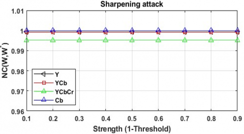 Gaussian noise and sharpening attacks were explored in Figures 13(e) and 13(f), with varying variance and threshold settings. The results indicated that NCs for both Gaussian noise and sharpening were effectively equal to 1. Compared to other schemes such as Y [37], YCbCr [38], and YCb, the proposed method clearly outperforms the others.
