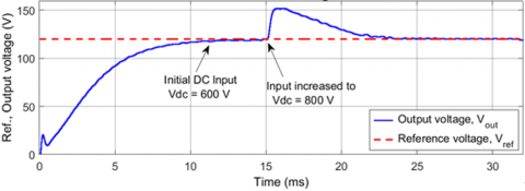 Figure 10. Step transient response of controller at Vref=120 V, R=2.4 Ω with Vdc=600 V and 800 V