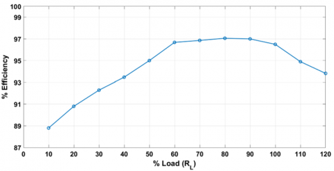 To investigate the efficiency of DC-DC converter, a simulation is carried out with the bus voltage regulated at Vdc=600 V, a reference voltage set to 120V, and a reference current set to 50A. The load resistor (RL) is varied gradually from 10% to 120% of the rated load. The corresponding input and output average power are measured, efficiency is calculated and plotted as shown in Figure 12. The results indicate that efficiency reaches its peak at 80% of the rated load condition and gradually decreases at both, lower and higher load conditions. Since the efficiency is evaluated at steady-state input-output conditions, the DSC logic has not impacted the overall converter efficiency.