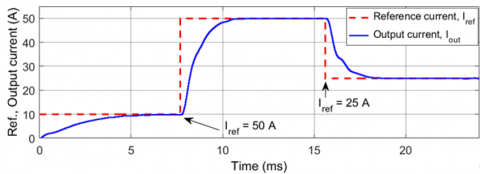 Figure 15. Step transient response of controller at Vdc=600 V, R=2.4 Ω with Iref=10 A, 50 A, 25 A