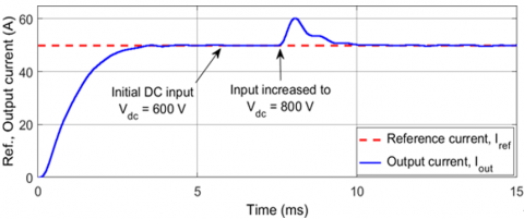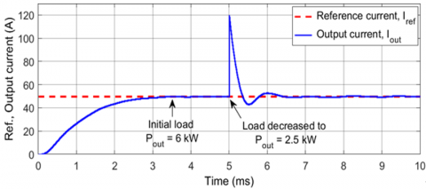 Figure 16. Step transient response of controller at Iref=50 A, Vdc=600 V with Pout=6 kW and 2.5 kW