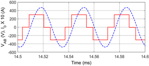 The performance of proposed controller under fluctuating source conditions is verified by changing the dc bus voltage from 600 V to 800 V and 450 V respectively as shown in Figure 17. These sudden changes in the dc bus voltage results into sudden increase or drop in the output current. Here, controller varies the PWM duty ratio and tracks the reference current level, Iref=50 A within 2.5 ms. To analyze this variation in the PWM duty ratio, two extreme conditions of dc bus voltage variation are considered here. Figure 18 depicts resonant converter’s output voltage and load current waveforms for different dc bus voltage levels, with identical parametric conditions.