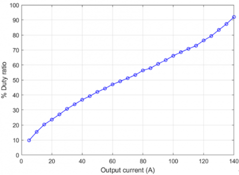 To investigate the safe operating range of this control system/current source, the output current is varied in the range of 5 A to 140 A, and the relationship of output current verses duty ratio is plotted as shown in Figure 19. Here, it is observed that the required output current range of 5 A to 140 A is maintained by varying the PWM duty ratio in the range 9.7% to 92%. In all experimental systems, the preferred operating duty range is between 20% to 80%. Thus, this current source can be safely used for all real-time applications within the specific output current range. These HIL simulation results perfectly validate the functionality of developed control strategy for both; constant voltage and constant current DC-DC converters. Overall, these outcomes validate both the viability of the control strategy and the efficacy of its implementation onto the FPGA platform.