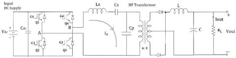 The four switches in this circuit operate at 50% duty ratio and the switch in each leg synchronously operates 180° out of phase. To prevent undesirable cross-conduction, a slight dead-time is introduced between the switching cycles of these complementary switches. In order to introduce a phase shift between two opposite legs, pulse width modulation is applied. This modulation stage is connected through a high frequency transformer to a rectifier bridge, filter and rated load, for isolation as well as the voltage or current scaling. The intermediate LCC resonant tank network between H-bridge inverter (modulation stage) and rectification stage, exhibits inherent AC gain, that is function of switching frequency and PSC-PWM duty ratio. Control of these two parameters thus allows output voltage and load current regulation, as they determine the input of rectifier based on different loading conditions. This modification of PSC-PWM duty ratio and switching frequency simultaneously is achieved using hybrid control strategy, discussed in section 3.